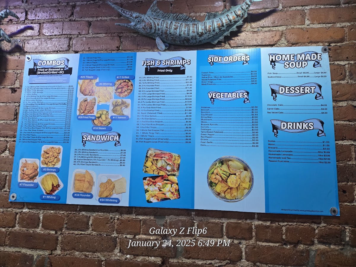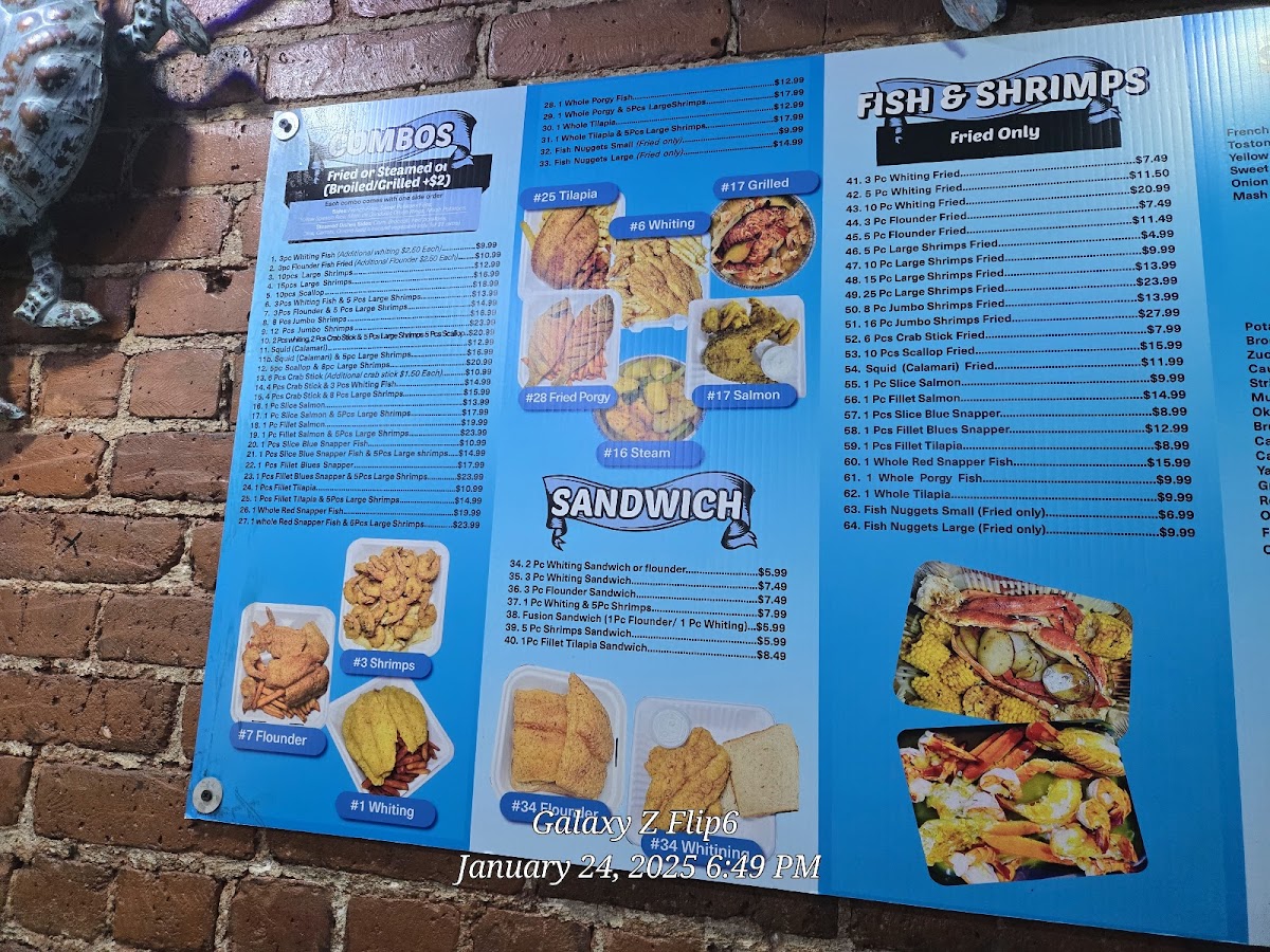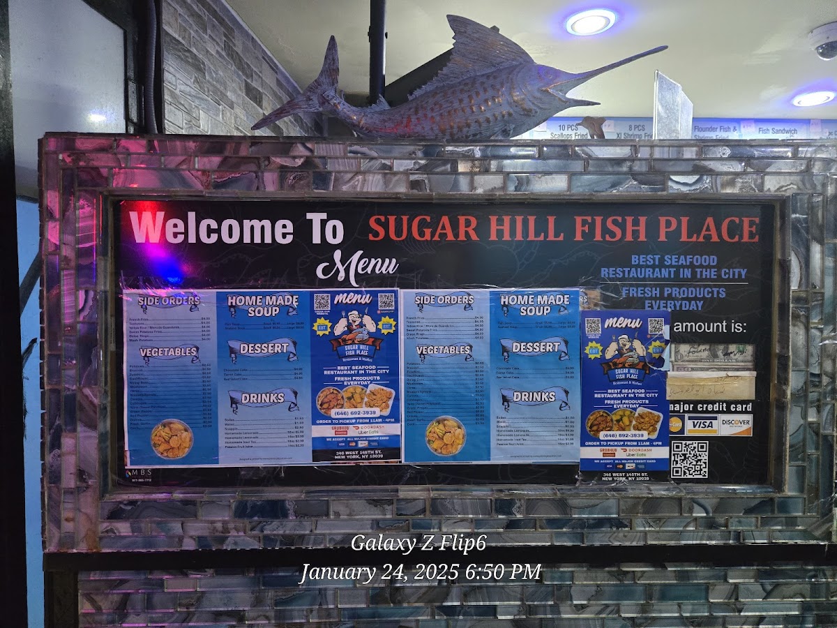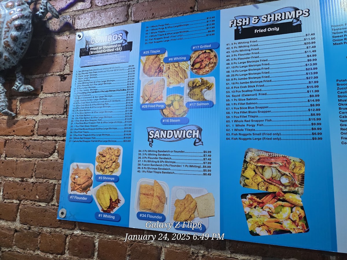 Overall, the menu at Sugar Hill Fish Place offers a generous range of seafood-focused options, and as a reviewer, I found it easy to appreciate both the variety and the flexibility it gives diners. The steam selections feel especially hearty, with combos like 54. 4 Bag Snow Crab Leg & 15 Pieces Jumbo Shrimp Steam With 2 Veggies and 52. 2 Bag Snow Crab Leg & 8 Pieces Jumbo Shrimp Steam standing out for their abundance, while simpler choices such as 31B. 12 Pieces Jumbo Shrimp Steam or 43. 1 Whole Tilapia Steam With 2 Veggies cater to those wanting a lighter but flavorful meal. The fried section leans into comfort classics, including 22B. 5 Pieces Whiting Fried Fish, 26B. 16 Pieces Jumbo Shrimp Fried, and 24B. 5 Pieces Flounder Fish Fried, along with larger portions like 25C. 25 Pieces Large Shrimp Fried for those with bigger appetites. Combo lovers will appreciate options like 8B. 2 Pieces Whiting Fish, 6 Pieces Large Shrimp & 6 Pieces Scallops Fried Combo or the seafood-forward 11C. 1 Slice Salmon Fish & 5 Pieces Jumbo Shrimp Fried Combo. Sandwiches are equally appealing, from the 21D. 3 Pieces Flounder Fish Sandwich to the mixed 21G. 1 Piece Whiting & 5 Pieces Large Shrimp Sandwich. Special plates, such as 65. 1 Fillet Blue Snapper Special Plate With 2 Veggies or 68B. 1 Whole Red Snapper & 8 Pieces Large Shrimp Special Plate, add a more premium touch. Lighter bites like Raw Clams, Crab Meat Patty, and Salmon Patty, plus veggie sides and items like Tostones or Yellow Rice, round out the meal, while customizable steaming options-such as the 1/2 Lb Large Shrimp With Shell Steam or 1 Lb Black Tiger Shrimp Jumbo Peeled & Deveined Steam-let diners tailor their order. With desserts like Chocolate Fudge Cake and Red Velvet Cake and drinks ranging from Passion Fruit Juice to Homemade Ice Tea, the menu ultimately delivers a satisfying balance of indulgence, freshness, and variety.
