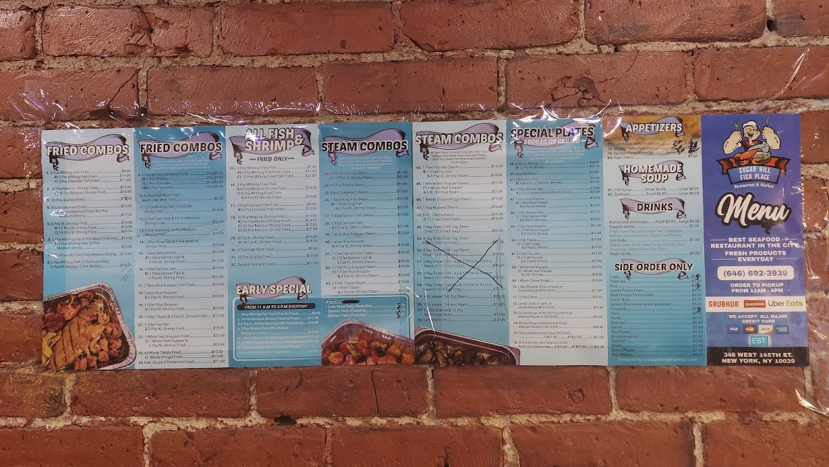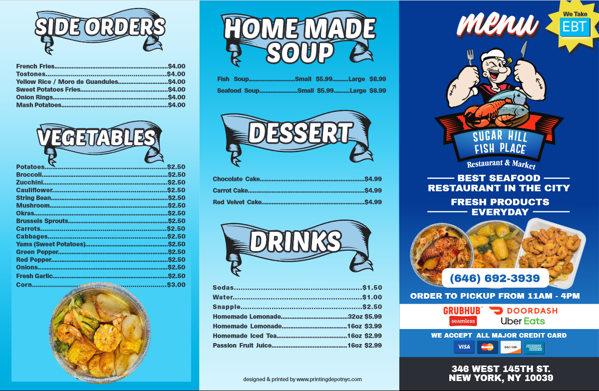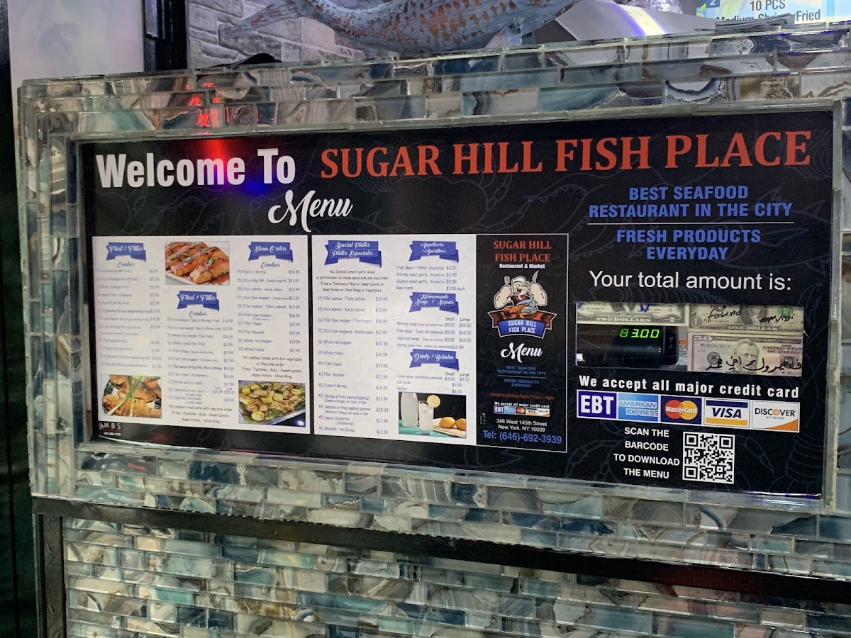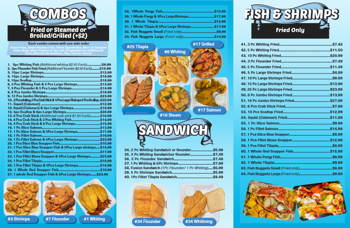 Overall, the menu at Sugar Hill Fish Place offers a generous range of seafood-focused options, and as a reviewer, I found it easy to appreciate both the variety and the flexibility it gives diners. The steam selections feel especially hearty, with combos like 54. 4 Bag Snow Crab Leg & 15 Pieces Jumbo Shrimp Steam With 2 Veggies and 52. 2 Bag Snow Crab Leg & 8 Pieces Jumbo Shrimp Steam standing out for their abundance, while simpler choices such as 31B. 12 Pieces Jumbo Shrimp Steam or 43. 1 Whole Tilapia Steam With 2 Veggies cater to those wanting a lighter but flavorful meal. The fried section leans into comfort classics, including 22B. 5 Pieces Whiting Fried Fish, 26B. 16 Pieces Jumbo Shrimp Fried, and 24B. 5 Pieces Flounder Fish Fried, along with larger portions like 25C. 25 Pieces Large Shrimp Fried for those with bigger appetites. Combo lovers will appreciate options like 8B. 2 Pieces Whiting Fish, 6 Pieces Large Shrimp & 6 Pieces Scallops Fried Combo or the seafood-forward 11C. 1 Slice Salmon Fish & 5 Pieces Jumbo Shrimp Fried Combo. Sandwiches are equally appealing, from the 21D. 3 Pieces Flounder Fish Sandwich to the mixed 21G. 1 Piece Whiting & 5 Pieces Large Shrimp Sandwich. Special plates, such as 65. 1 Fillet Blue Snapper Special Plate With 2 Veggies or 68B. 1 Whole Red Snapper & 8 Pieces Large Shrimp Special Plate, add a more premium touch. Lighter bites like Raw Clams, Crab Meat Patty, and Salmon Patty, plus veggie sides and items like Tostones or Yellow Rice, round out the meal, while customizable steaming options-such as the 1/2 Lb Large Shrimp With Shell Steam or 1 Lb Black Tiger Shrimp Jumbo Peeled & Deveined Steam-let diners tailor their order. With desserts like Chocolate Fudge Cake and Red Velvet Cake and drinks ranging from Passion Fruit Juice to Homemade Ice Tea, the menu ultimately delivers a satisfying balance of indulgence, freshness, and variety.